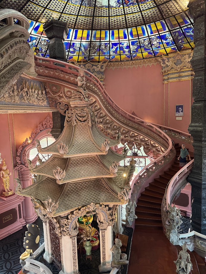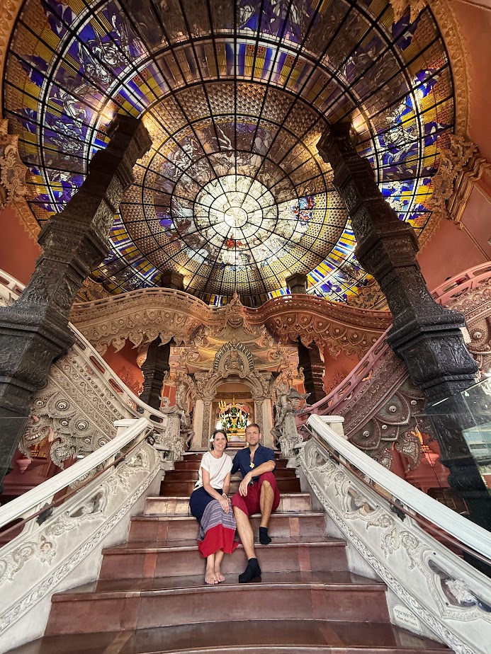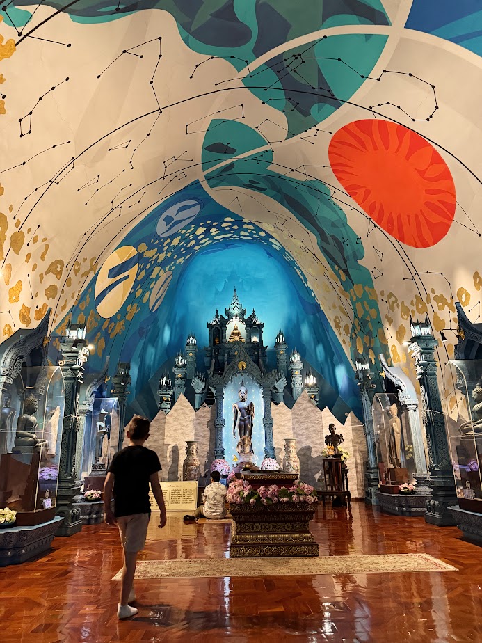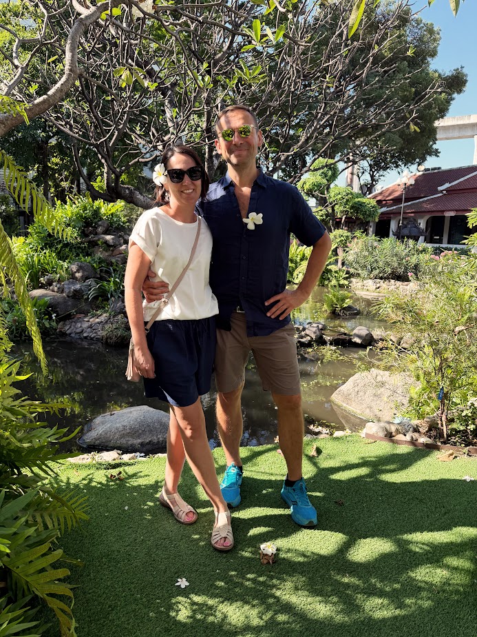 Budynek muzeum otoczony jest przepięknym ogrodem, w którym warto zatrzymać się na dłuższą chwilę. Żeby wejść do muzeum musimy mieć zakryte ramiona i kolana. Na miejscy można wypożyczyć odpowiednie okrycia (takie jak mamy z Tomkiem na zdjęciu poniżej). Bilety można kupić w kasie na miejscu albo taniej przez różne aplikacje np Klook albo Trip.com. Nam zwiedzanie zajęło ok 1,5 godziny a za bilety zapłaciliśmy 780 TBH.