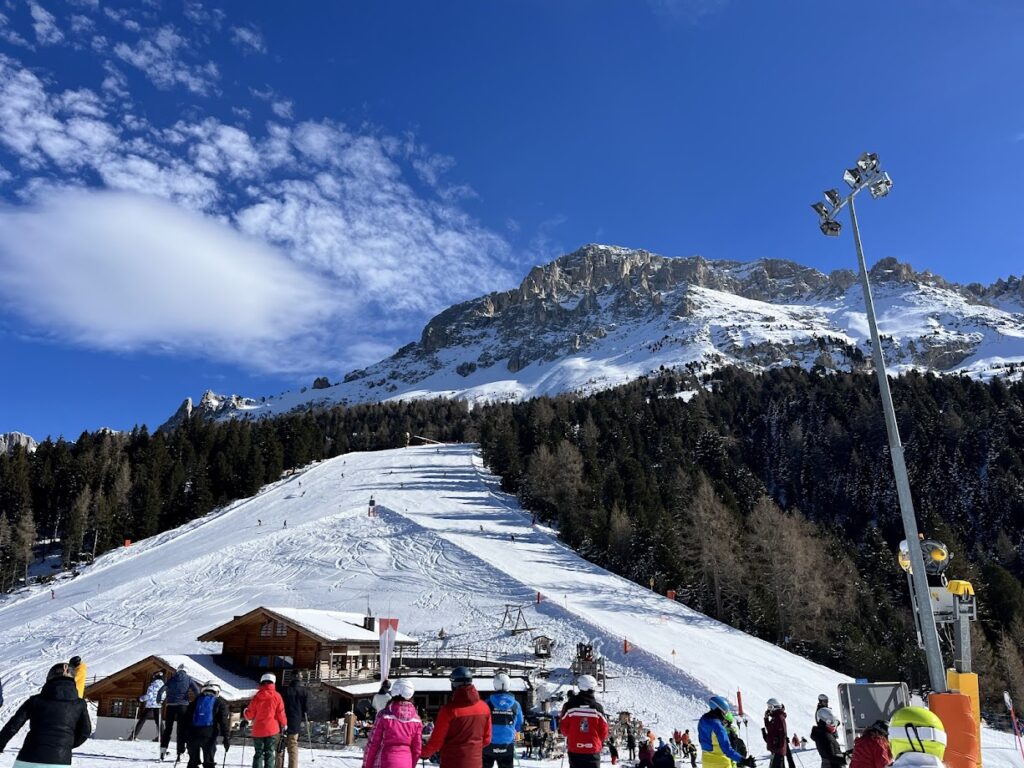 Latemar to największy ośrodek w regionie oferujący 50 km tras. Można się na niego dostać z 3 punktów: Pampeago, Predazzo (zaraz przy skoczni) oraz Obereggen. My ze względu na to, że mieszkaliśmy w Cavalese oraz że szkółka zaczynała w tym miejscu, dojeżdżaliśmy do Pampeago. Lojalnie ostrzegam, że dobre miejsca parkingowe są dostępne mniej więcej do godziny 9. Niczego nieświadomi, pierwszego dnia przyjechaliśmy ok 9.30 i musieliśmy podejść z parkingu oddalonego ok 500 m. Pod górkę, z nartami na plecach i gromadką dzieci to nic przyjemnego. Wynikowo spóźniliśmy się na pierwszą zbiórkę szkółki (która zaczynała się o godz. 10). Kolejne dni wychodziliśmy ok pół godziny wcześniej i o 9 byliśmy już na stoku gotowi do zjazdów.