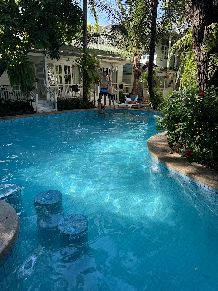 My w Hua Hin zatrzymaliśmy się na 4 noce w niewielkim butikowym hotelu The Green Gallery. Jeżeli szukacie luksusu, to nie tam, ale nam się bardzo podobał szczególnie styl przypominający nam Key West na Florydzie. Hotel jest zaraz przy plaży, ale niestety podczas naszego pobytu był bardzo wysoki przypływ i woda sięgała pod sam teren hotelu. Więc niestety plaży w ogóle nie było.