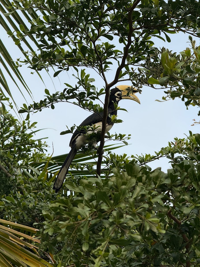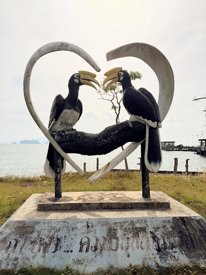 Widzieliśmy za to całe stada przelatujące wieczorem i rano nad naszymi domkami, a jednego dnia jeden z nich zawitał u nas w ogrodzie. Koh Yao Noi słynie z populacji dzioborożców, a ich pomniki można zobaczyć przy obu przystaniach.