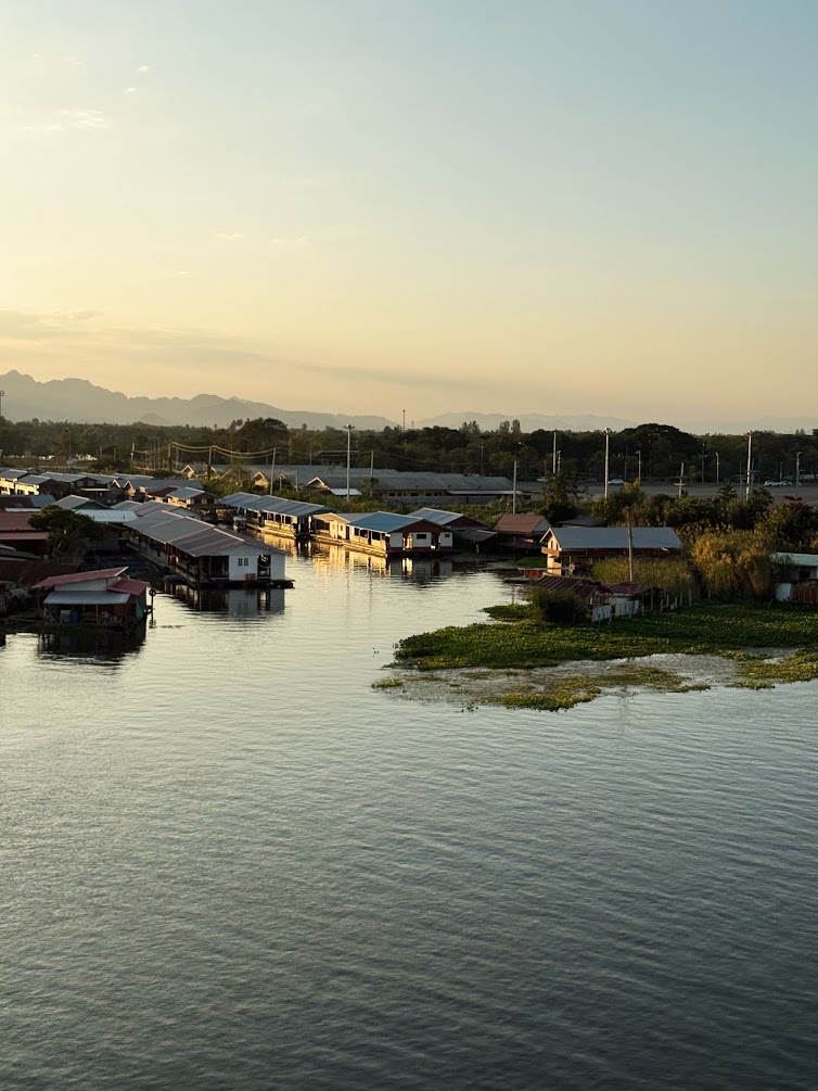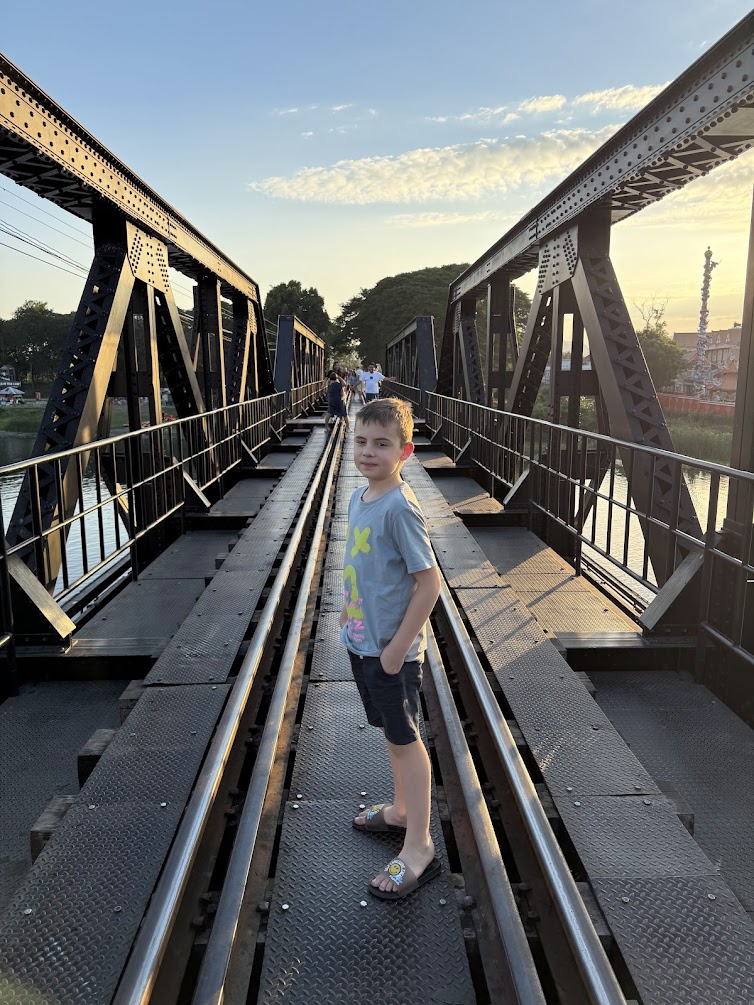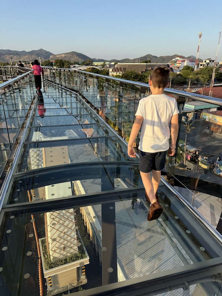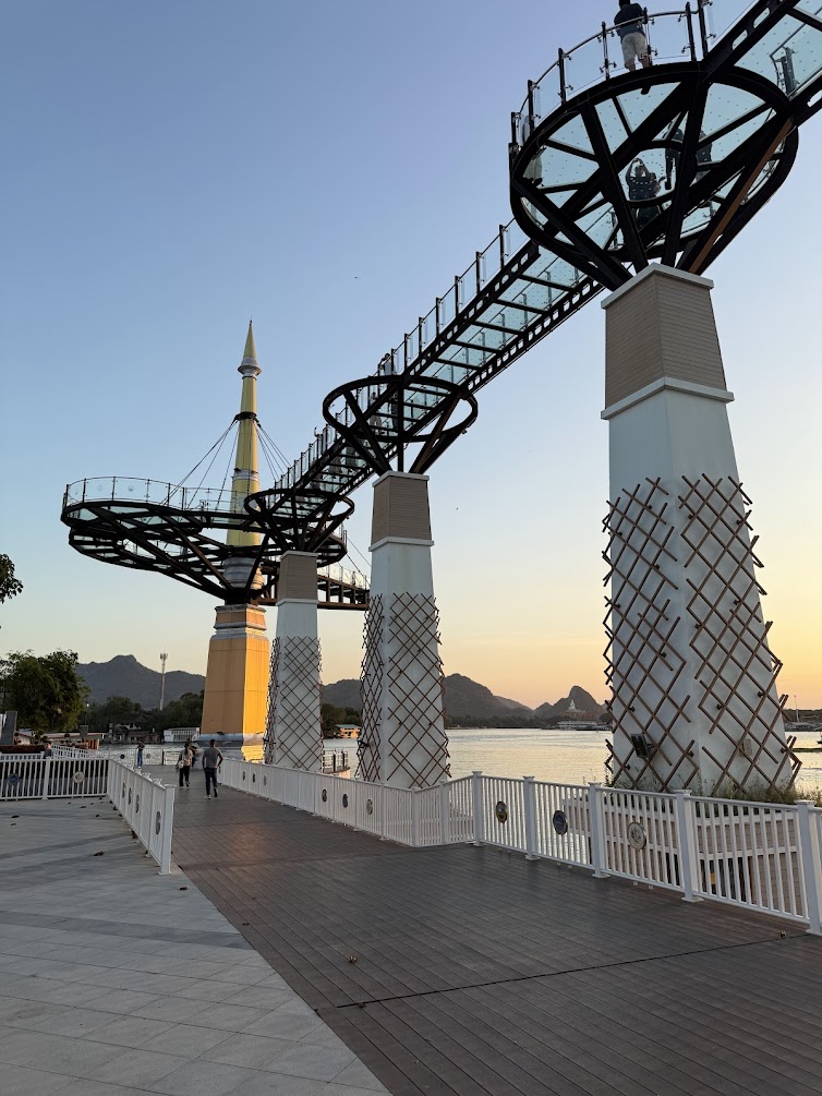 Jako, że z Bangkoku wyjechaliśmy dosyć późno, a do tego sporo czasu spędziliśmy w powyższej restauracji, do Kanchanaburi dotarliśmy dopiero ok godz. 17 i spacer po przeszklonym moście zaliczaliśmy chwilę przed zachodem słońca. Most ma wysokość 12 metrów i długość 150 m. Całość jest przeszklona, więc tylko dla osób o mocnych nerwach. Ewidentnie ztraumatyzowałam tym całą moją rodzinę 🙂 Z mostu rozpościera się widok na rzekę Kwai oraz jej połączenie z rzeką Maeklong.