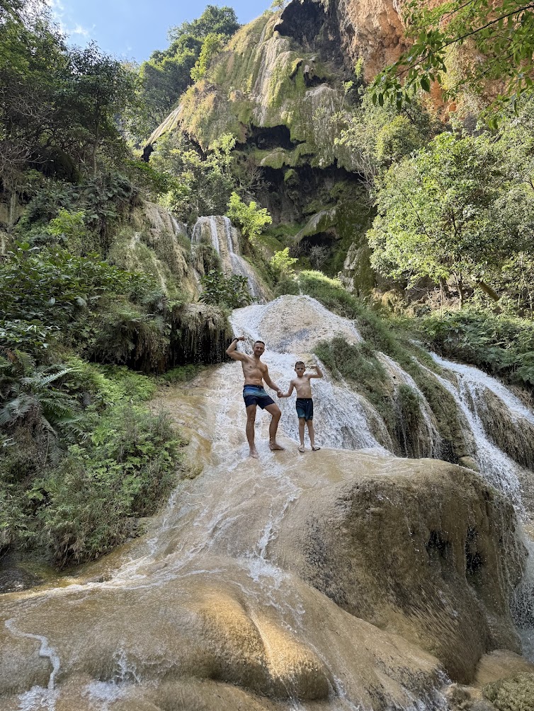 Skały wapienne przy poziomie 7 są całkowicie nieśliskie. Aż niesamowite z jaką łatwością można się na nie bezpiecznie wspinać. Adam tego dnia był bardzo zadowolony zarówno ze wspinania się po skałach, jak i kąpieli w wodospadach.