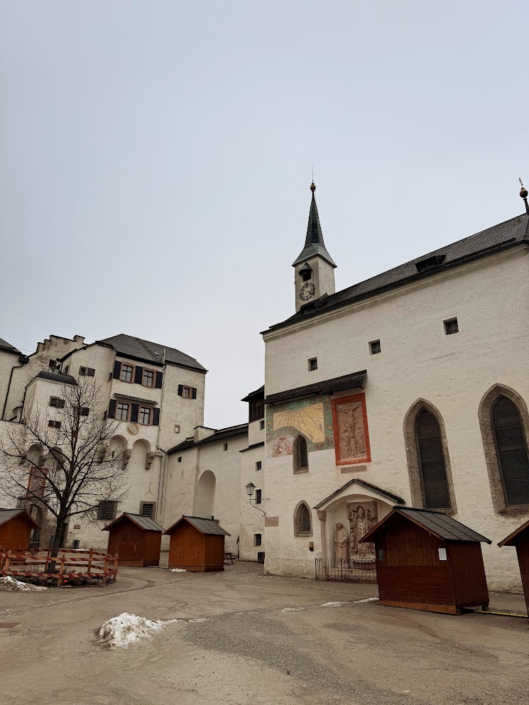 Jak widzicie na zdjęciach poniżej, pogoda nie była po naszej stronie. Było szaro buro i zimno. A na zamku zimniej niż na zewnątrz! Dawno tak nie zmarzliśmy jak zwiedzając twierdzę w Salzburgu, więc lojalnie ostrzegam!