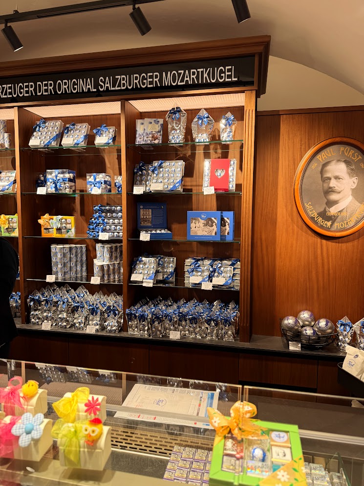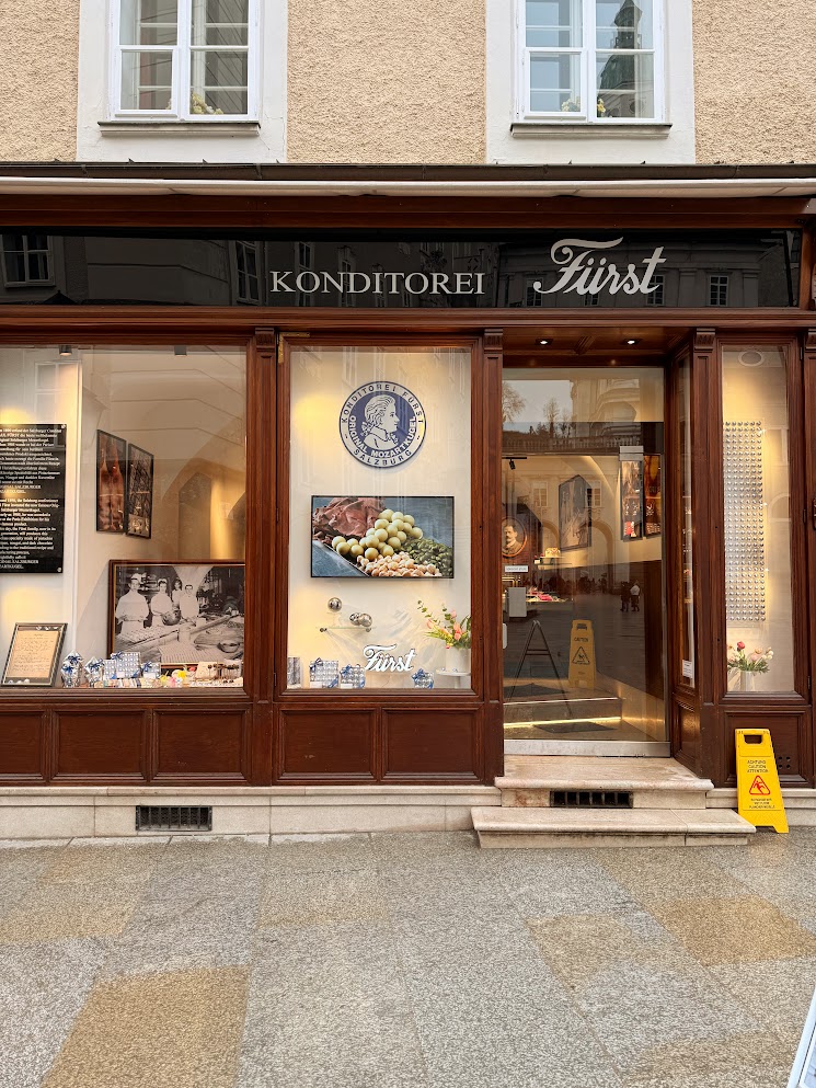 Pewnie każdy z Was, kto był kiedyś w Austrii zna ich słynne Mozartkugel. Stworzone przez Paula Fürsta praliny wypełnione marcepanem i pistacjami, zatopione w nugacie i ciemnej czekoladzie znane są na całym świecie. Obecnie w Salzburgu znajduje się sześć cukierni należących do rodziny Fürst, gdzie możemy kupić te najbardziej oryginalne kulki. W jednej z ich cukierni planowaliśmy uczcić urodziny Gabi. Jakie było nasze rozczarowanie, kiedy okazało się, że cukiernia na starówce jest w remoncie! Nigdzie nie znaleźliśmy takiej informacji, więc byliśmy bardzo zaskoczeni. Wynikowo kupiliśmy kilka kulek w sąsiednim sklepie firmowym (ich cena jest nieporównywalna do tych standardowych), a na torta poszliśmy do innej kawiarni.